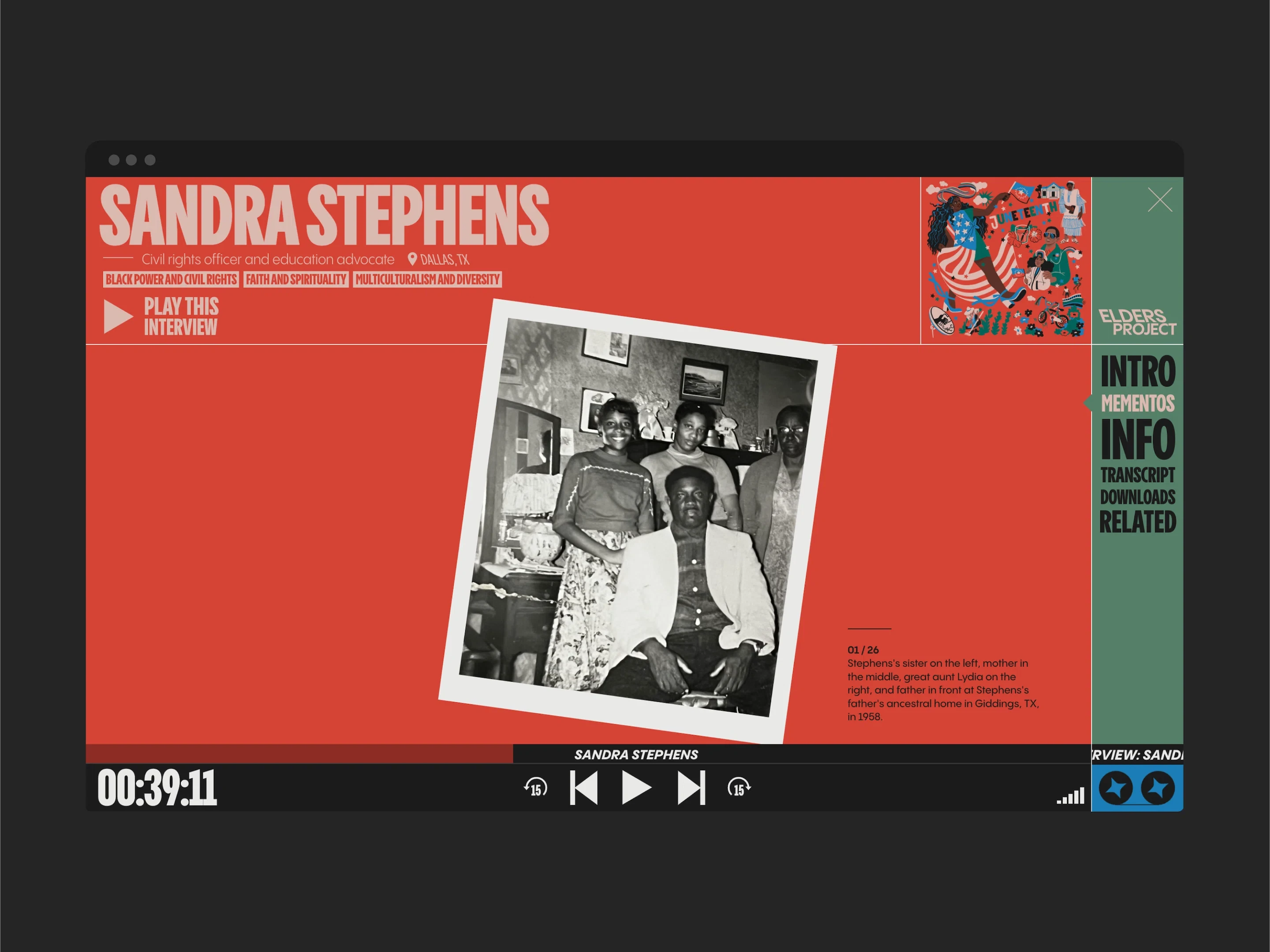 The Elders Project is archived at the Oral History Archives at Columbia, made widely available through an award-winning digital archive, and has been interpreted through plays, books, artwork, music, and community events across America.