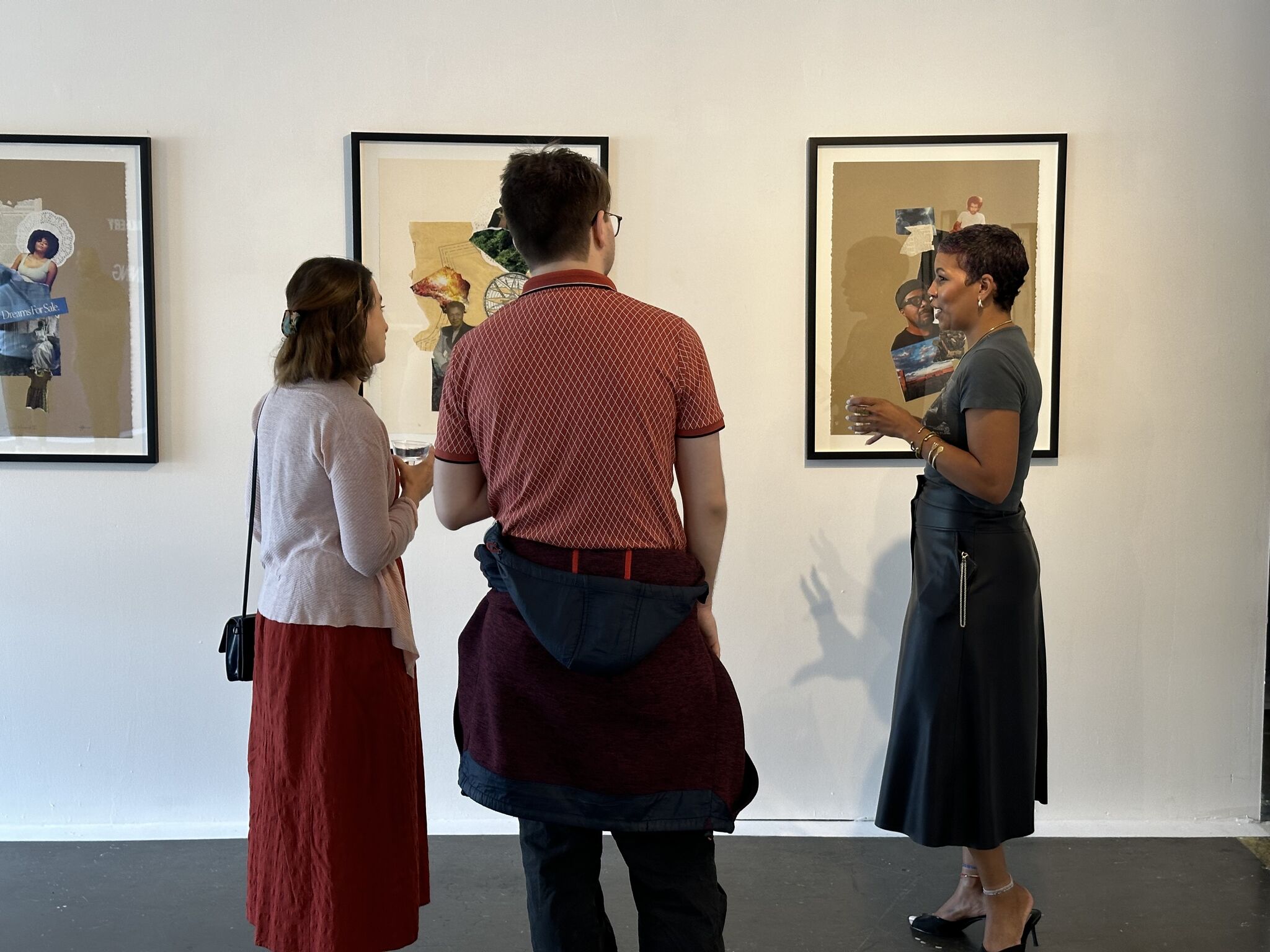 Philadelpha-based artist Jillian M. Rock discusses her collage series based on the Elders Project, Celestial Movements, with visitors at The Bishop Gallery in Brooklyn, NY. Summer 2024.