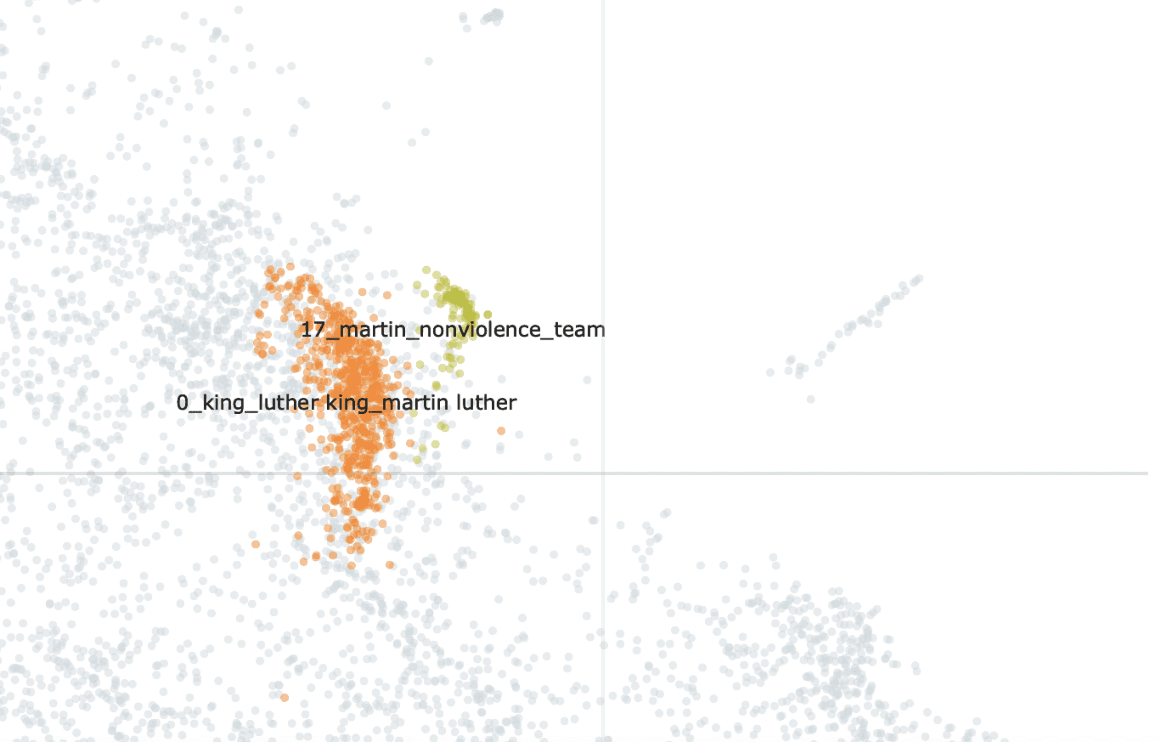 A map of conversations in the Life Stories archive (partial view). Each dot represents a conversation; dots placed near each other cover similar topics.